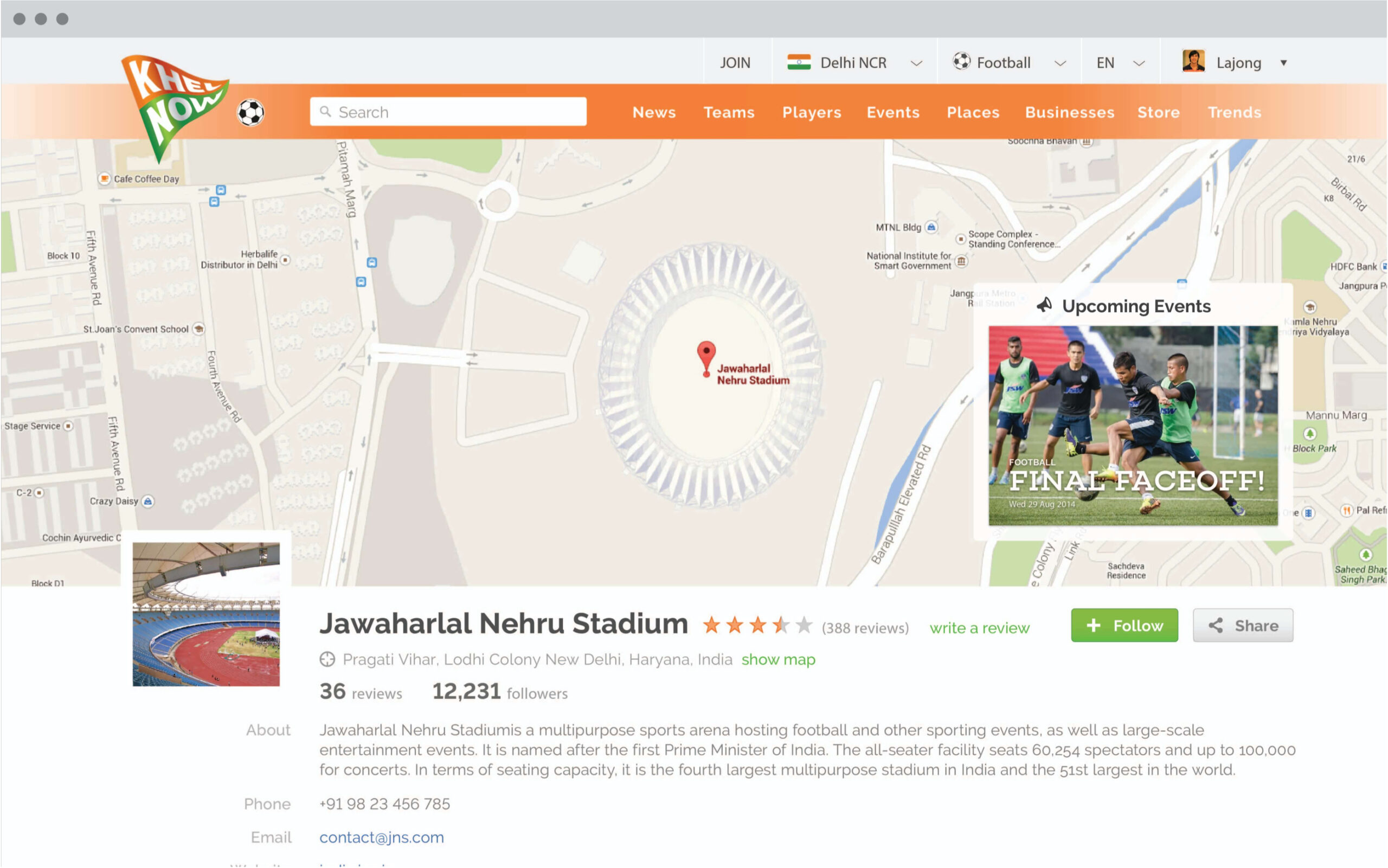 KhelNow is the first Indian social network where sports fans, hyperlocal events, businesses and stores come together to discuss, market and know what's the latest with the sport of their choice.